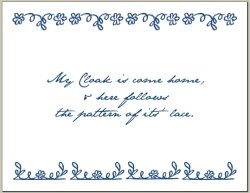 Janeites will love this clever stationery from our sister chapter JASNA East PA. The quote and the lace pattern (and the stray apostrophe) are from Jane Austen’s letter to her sister Cassandra of Sunday, 2 June 1799. The font used is Pia Frauss’ Jane Austen font, based on Jane’s handwriting, and the color of the ink is English Manor, the color for December 16–Jane’s birthday–according to Colorstrology. The card stock is light gray speckled with blue and the cards are 5.5 inches wide by 4.25 inches high.