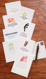 These hand-printed, antique-letterpress note cards—blank inside and measuring about 4½”x6″—are infused with the charm of Jane Austen herself. Featuring colorful old-fashioned images and quotes from Austen’s novels, this stationery will carry your messages with pleasantness and propriety—and a dash of sharp wit! Collection includes one each of eight designs, plus envelopes. Available at Bas Bleu.