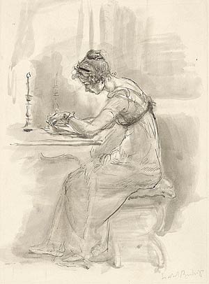 The drawing to the left: Scene from Pride and Prejudice: “The examination of all the letters which Jane had written to her.” Isabel Bishop (1902–1988) 20th century Pen and black ink, gray wash, over pencil Gift of Mrs. Robert E. Blum in honor of Charles Ryskamp on his 10th anniversary as director, 1979; 1979.32:15