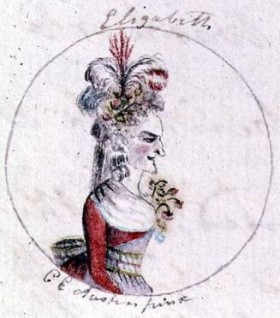 Some also recognize Mrs. Austen mère in the less flattering image of Queen Elizabeth I in an anachronistic 18th century dress.