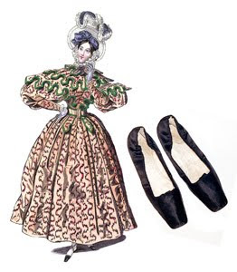 Early nineteenth century lady’s silk slippers had simple lines and plain ornamentation. Variations in decoration ranged from a tiny silk bow to a larger more elaborate bow or rosette. At times the slippers featured silk ribbon ankle ties sewn into the sides. Most were straight last shoes, that is, shoes that are not fitted for right and left feet. Read full story.