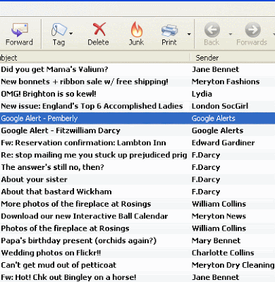 It was created by Mark Brownlow at Famous Inboxes blog. I love how Charlotte Collins posted wedding photos on flickr and Darcy sent an email with the subject line: “The answer’s still no, then?” The apparent response: “Stop emailing me you stuck up prejudiced prig.” Very funny!