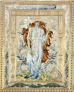 One of the key attractions in this sale is a rare needlework book cover from The Book of Beauty, 1896. This pre-Raphaelite needlework book cover was designed for The Book of Beauty: A Collection of Beautiful Portraits with Literary, Artistic and Musical Contributions by Men and Women of the Day, edited by Mrs F Harcourt Williamson and published by Hutchinson & Co.