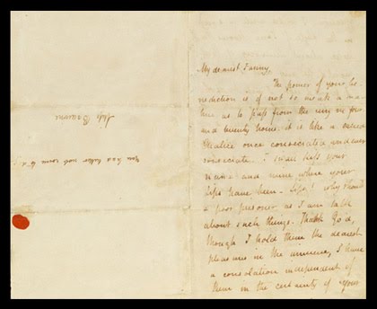 Keats wrote the letter – the only one of the 39 surviving letters to Fanny Brawne still in private hands – in 1820 when he was fatally ill with consumption (TB). Though Fanny lived next door to Keats their meetings were restricted by his health which also prevented even the most limited physical contact. Keats refers to this painful constraint in the letter, regretting the fact that they cannot kiss – TB being highly contagious – but consoling himself with the certainty of her love.