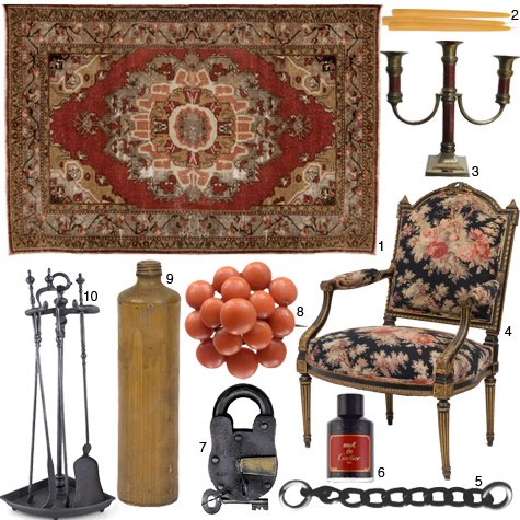 1. Vintage Oushak Rug, $1495; 2. Beeswax Tapers, $10/set of 2; 3. Vintage Brass and Wood Candelabra, $36; 4. Vintage Armchair, $2495; 5. Iron Chain, $6; 6. Fountain Pen Ink, $25; 7. Vintage Repro Padlock, $18; 8. Antique Bead Brooch, $165; 9. Vintage Bottle, $12; 10. Serpent Chimney Valet, $1150