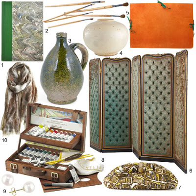 1. Marbled Paper Notebook, $25; 2. Paintbrush Set, $2; 3. Green Glazed Pitcher, $495; 4. Rounded Vase, $149; 5. Custom-made Leather Portfolio; 6. Antique Tufted Screen, $2195; 7. Beaded Clutch, $248; 8. Artist’s Wooden Box Set, $529; 9. Pearl Studs, $45; 10. Paisley Shawl, $250