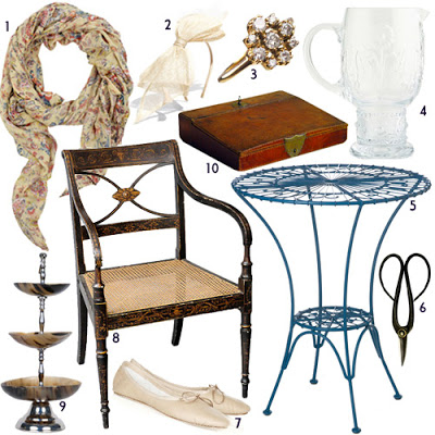 1. Paisley Scarf, $19; 2. Bow Headband, $38; 3. Conroy & Wilcox Marie Antoinette Ring, $1920; 4. Sunflower Pitcher, $28; 5. Scroll Bistro Table, $198; 6. Floral Clippers, $13; 7. Chloe Ballet Flats, $375; 8. Antique Regency Chair, $900; 9. Serving Stand, $150; 10. Antique Writing Box