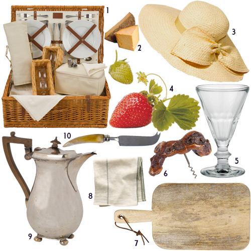 1. English Willow Picnic Basket, $234; 2. Cheshire Cheese, $13.50; 3. Floppy Straw Hat, $48; 4. Strawberry Growing Kit, $13; 5. Fluted Glass, $8; 6. Grapevine Corkscrew, $32; 7. Bread Board, $56; 8. Crossroads Napkins, $16; 9. Vintage English Coffee Pot, $98; 10. Horn Cheese Knives, $58/set of 3