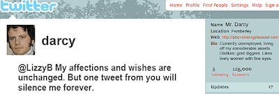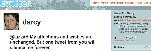 Ok, I admit it. I’m an Internet addicted Janeite. So here it is, my latest discovery: Darcy on Twitter (created by the lovely Austen Pride.)