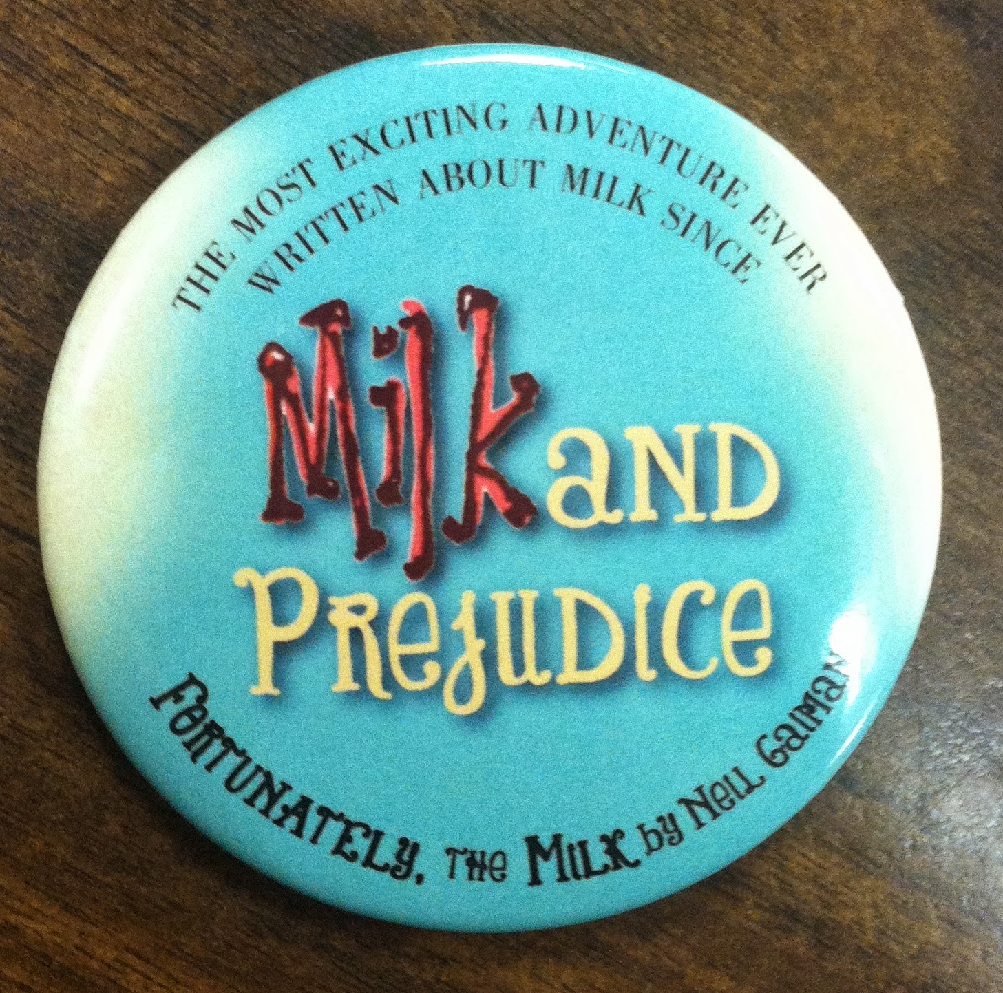 Promotional button for Neil Gaiman’s new children’s book Fortunately, the Milk